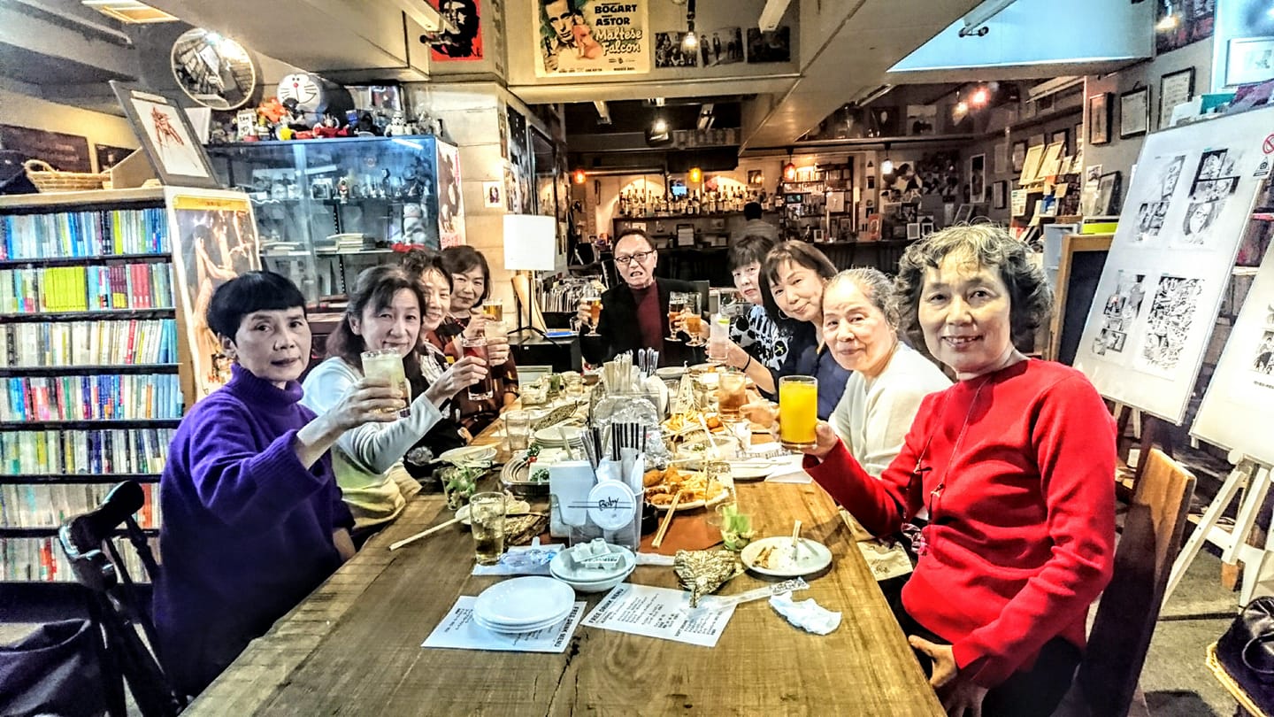 今宵は、天六(天神橋筋六丁目)のブックカフェ「ワイルドバンチ」で、淑女の皆さまと打ち上げでした~🍷🍻