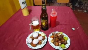 激辛のチキンと魚のフライをアテ(ツマミ、肴)にライオン・ビールをグビリ~🍻