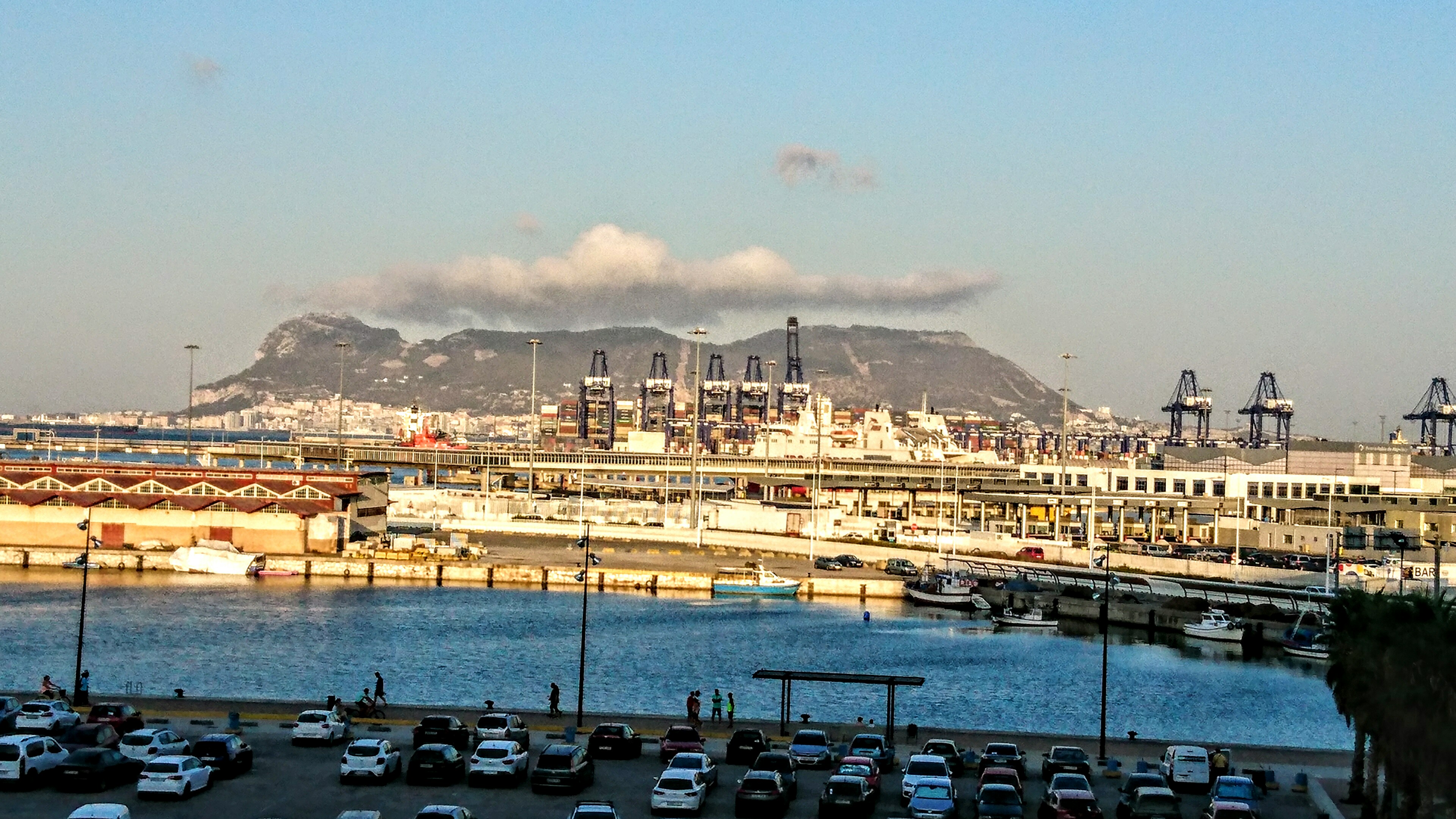 朝、アルヘシラスの港から対岸のジブラルタルを眺めました。