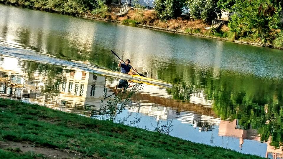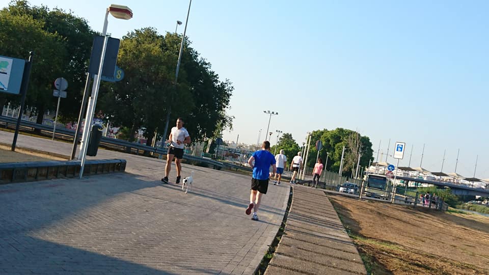 川辺でランニングやウォーキングをする人たち、朝寝をしているおばあちゃん、川でボートを漕いではる人もいてはります。