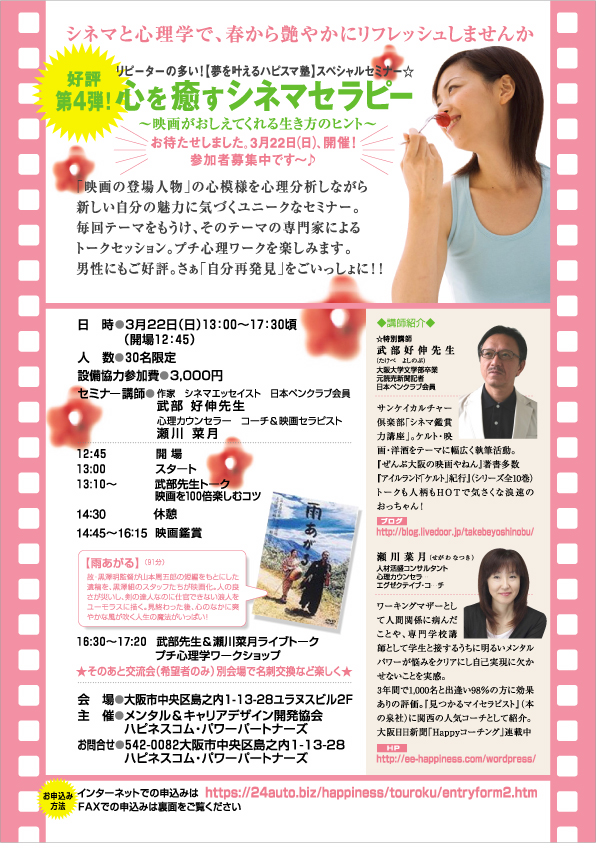 ぼくは心理カウンセラーでもなんでもないので、映画のことについてべらべら喋るだけですが、講演のあとに主宰者の瀬川菜月さんが心理学的に有益なアドバイスを与えてくれはると思います。