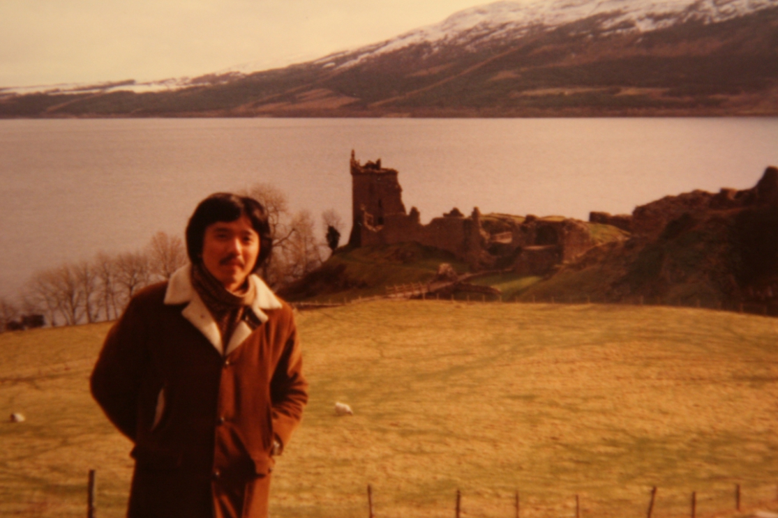 うしろの湖は琵琶湖とちゃいます。怪獣ネッシーで知られる英国スコットランドのネス湖です。廃墟と化した建物はアーカート城。ネス湖を見渡せる絶好の眺望ポイントです。