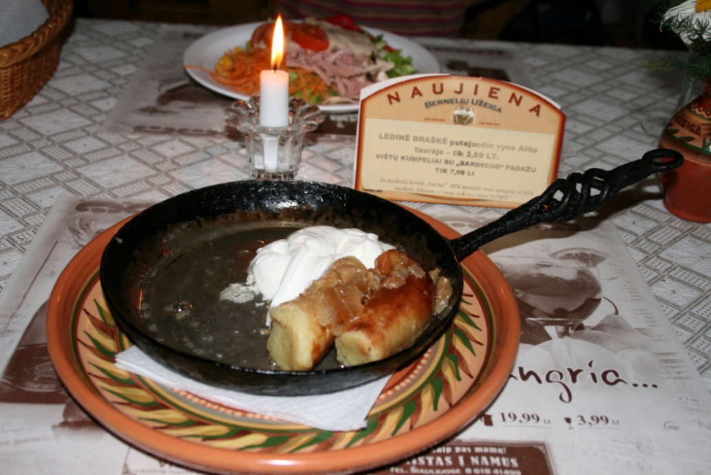 飛行船に似たこれもジャガイモ料理。ドイツの飛行船ツェッペリン号にあやかって、その名もズバリ、ツェペリナイ。単にリトアニア語に訳しただけ。なかにミンチっぽお肉が入っていて、あっと言う間に平らげてしまいました。