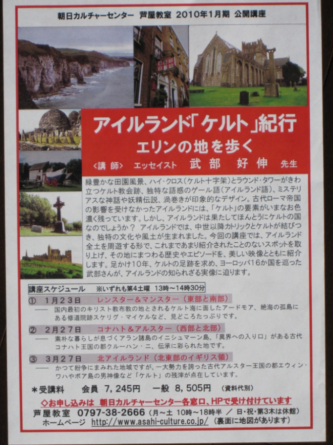 朝日カルチャー芦屋教室で、ぼくが担当する公開講座『アイルランド「ケルト」紀行 エリンの地を歩く』です。1月~3月にかけて3回、開催します。