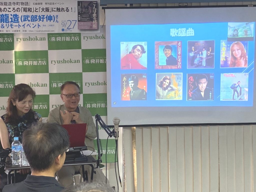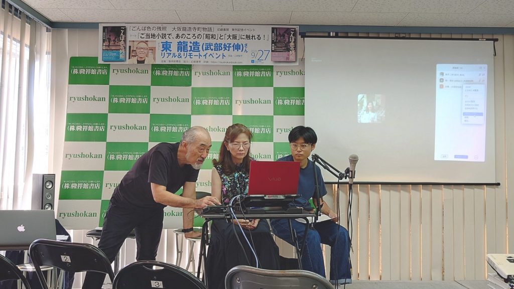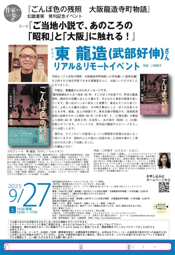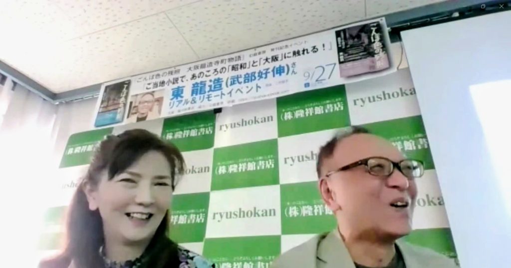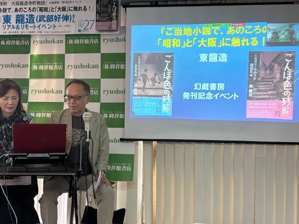 昨日の昼下がり、大阪・谷町六丁目の隆祥館書店で、東(ひがし)龍造の筆名で編んだ新作小説『ごんぼ色の残照 大阪龍造寺町物語』〈小学生編〉+〈高校生編〉(幻戯書房)の発刊記念イベントが開催されました。