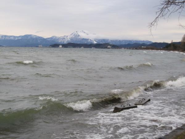 眼を北に転じると、湖面のはるか向こうに比良山系が連なっています。どうしようもなく寒々しい冬の山。