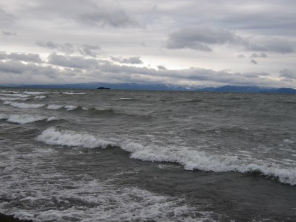 今朝、食事の前、猛烈に吹きつける北風に当たりながら、ひとりで湖畔を散策~。