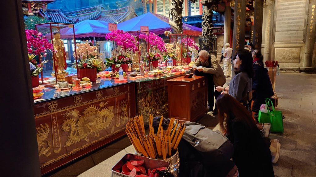 龍山寺は仏教や道教のほか、100以上の民間信仰の神々を祀っているとかで、異色なオーラを放っていました。