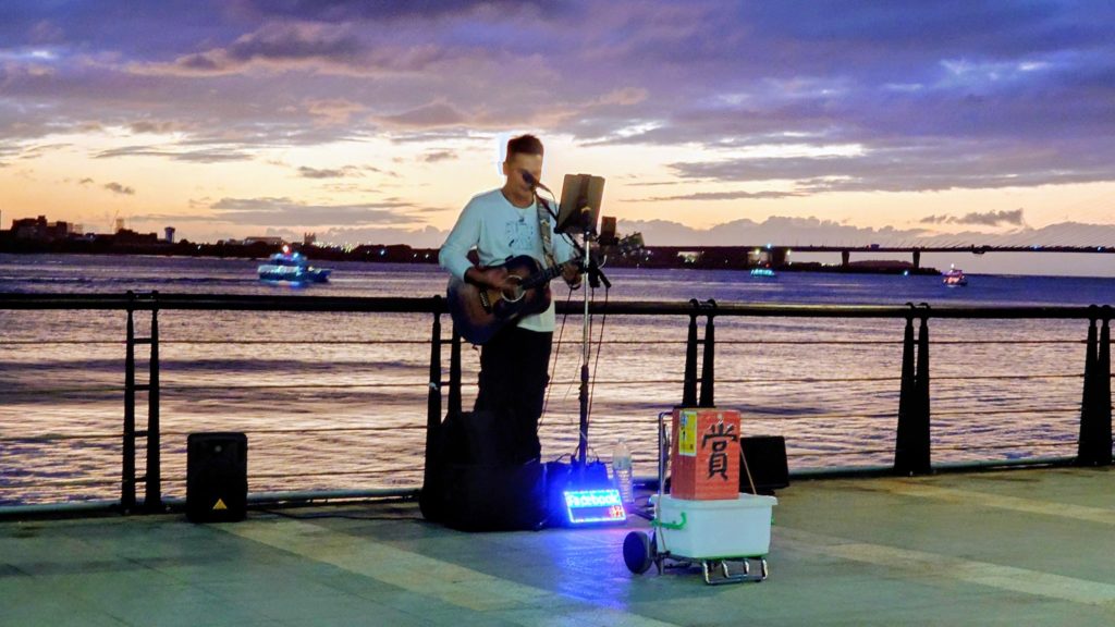 川辺の公園では、歌唱力を披露する自称シンガーたちが競うように熱唱していました。