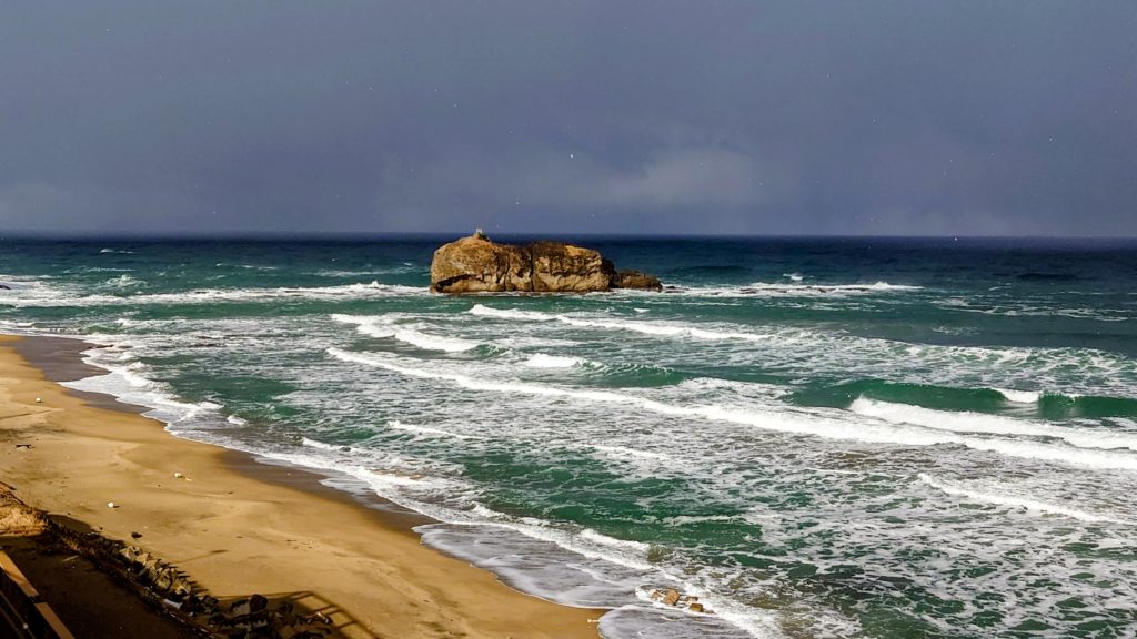 白うさぎが鰐(ワニ=サメ)を騙してこちら(因幡の国)へ渡ってきた「淤岐(おき)の島」が荒波に洗われていました。