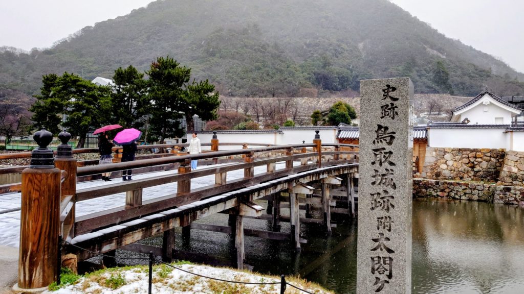 バスで鳥取駅へ戻り、雪が舞う中、鳥取城址を見物しました。