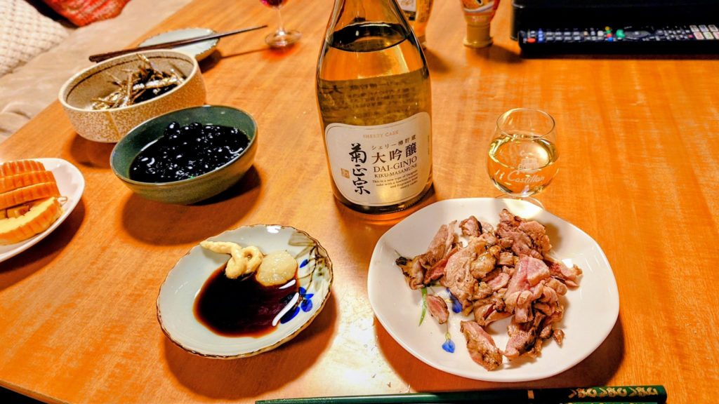 お酒は、神戸の知人、野瀬さんにプレゼントしてもらった、シェリー樽貯蔵の大吟醸「菊正宗」。