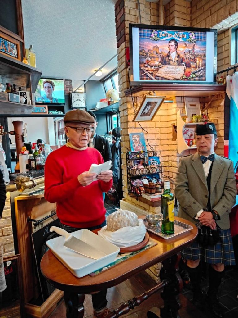 ハギスにナイフを入れる前に、バーンズの詩『ハギスに捧げる詩(Adress to a Haggis)』を朗読するのが、いわばクライマックスなんですが、昨日はなぜか、正装とはほど遠い、カジュアル姿丸出しのぼくに朗読の大役が回ってきました。