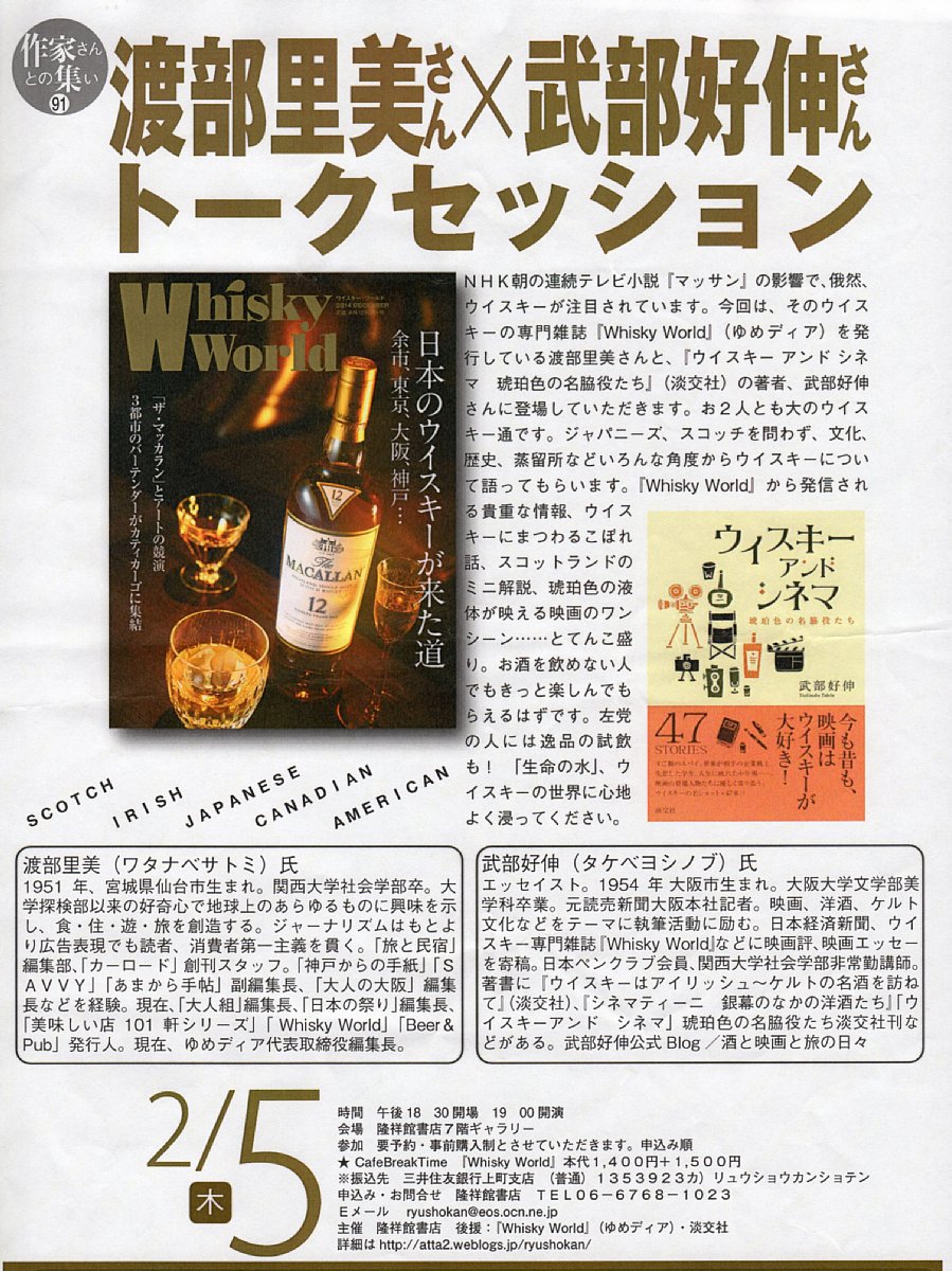 全国で唯一のウイスキー専門雑誌『Whisky World』の発行人、渡部里美さん(ゆめディア社長)とぼくとのイベントです。