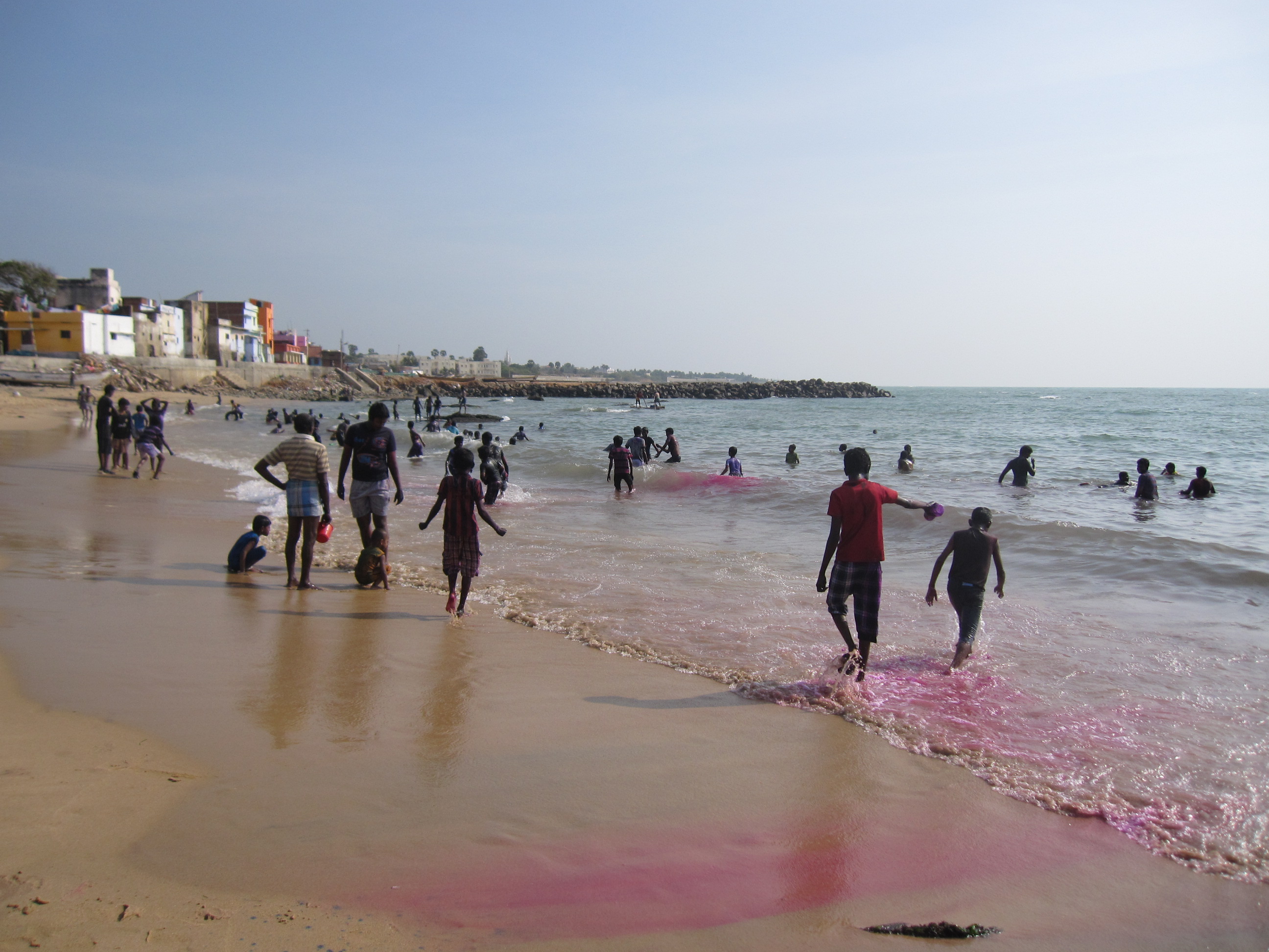 子供たちはみな、紫色に染まっており、海に飛び込んで遊んでいます。